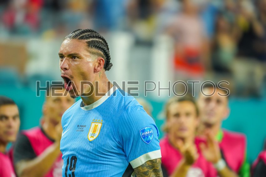 Miami Gardens, Florida, USA, June 20, 2024, Uruguay forward Darwin Núñez #19 celebrate after scoring during the 2024 Copa America at the Hard Rock Stadium. (Photo Credit: Marty Jean-Louis)