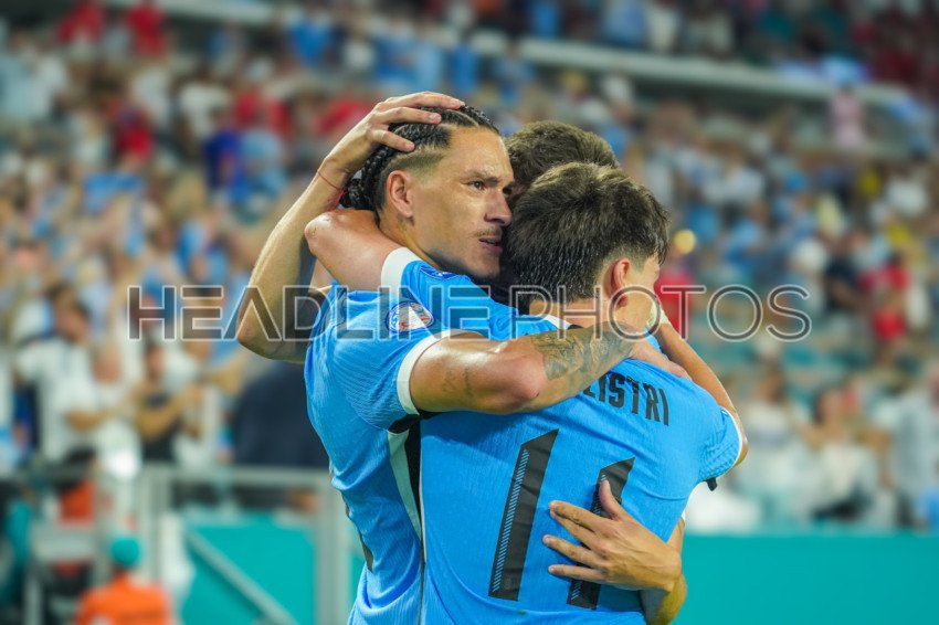 Miami Gardens, Florida, USA, June 20, 2024, Uruguay players celebrate goal during the 2024 Copa America at the Hard Rock Stadium. (Photo Credit: Marty Jean-Louis)