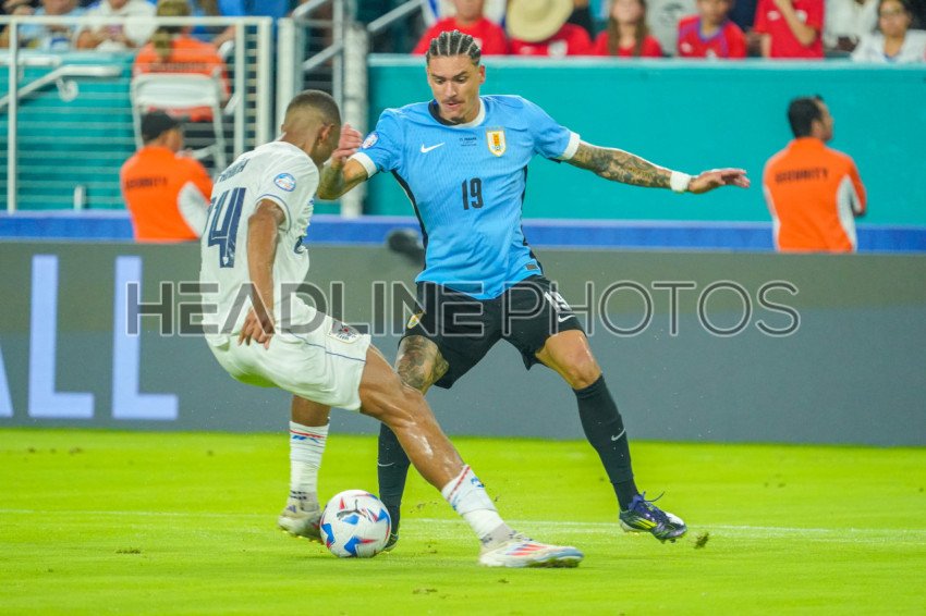 Miami Gardens, Florida, USA, June 20, 2024, Uruguay forward Darwin Núñez #19 attempt to make a steal from Edgardo Fariña #24 during the 2024 Copa America at the Hard Rock Stadium. (Photo Credit: Marty Jean-Louis)
