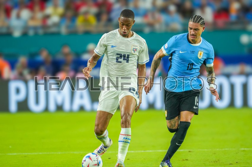 Miami Gardens, Florida, USA, June 20, 2024, Panama defender Edgardo Fariña #24 runs up field as Darwin Núñez #19 runs behind during the 2024 Copa America at the Hard Rock Stadium. (Photo Credit: Marty Jean-Louis)