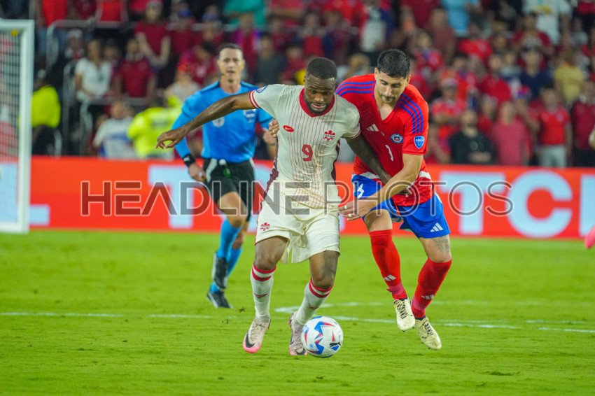 Orlando, Florida, USA, June 20, 2024, Canada forward Cyle Larin #9 runs up field as he receives pressure from Guillermo Maripán #3 during the 2024 Copa America at Inter&Co Stadium. (Photo Credit: Marty Jean-Louis)