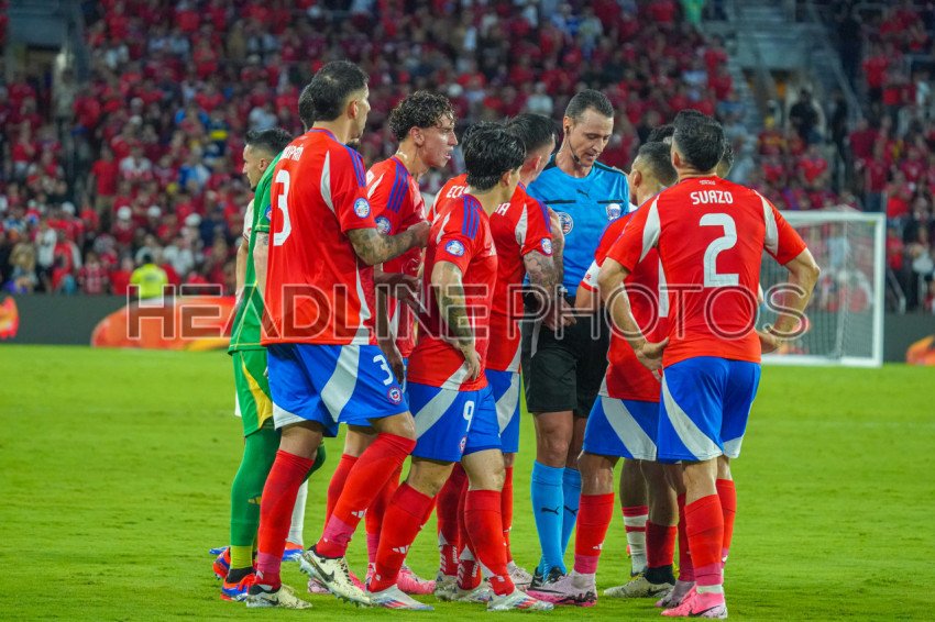 Orlando, Florida, USA, June 20, 2024, Chile players argue with the Referee during the 2024 Copa America at Inter&Co Stadium. (Photo Credit: Marty Jean-Louis)