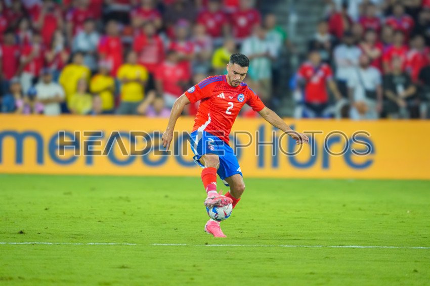 Orlando, Florida, USA, June 20, 2024, Chile defender Gabriel Suazo #2 receives a pass during the 2024 Copa America at Inter&Co Stadium. (Photo Credit: Marty Jean-Louis)