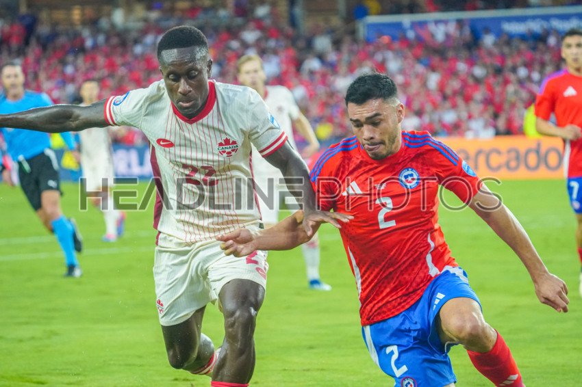 Orlando, Florida, USA, June 20, 2024, Chile player Gabriel Suazo #2 and Canada player Richie Laryea #22 fight for the ball during the 2024 Copa America at Inter&Co Stadium. (Photo Credit: Marty Jean-Louis)