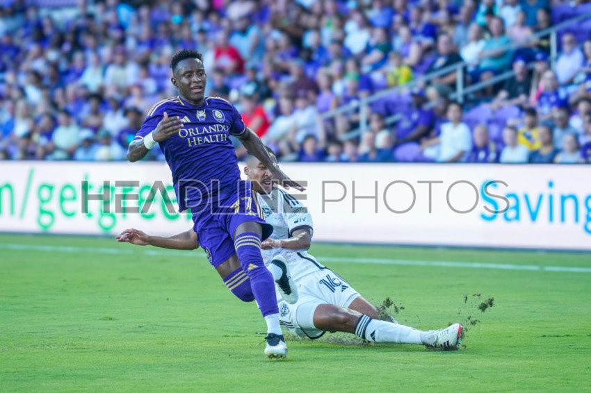 Orlando, Florida, USA, July 6, 2024, Orlando City SC midfielder Ivan Angulo #77 runs as Garrison Tubbs #16 kicks the ball out at Inter&Co Stadium. (Photo Credit: Marty Jean-Louis)