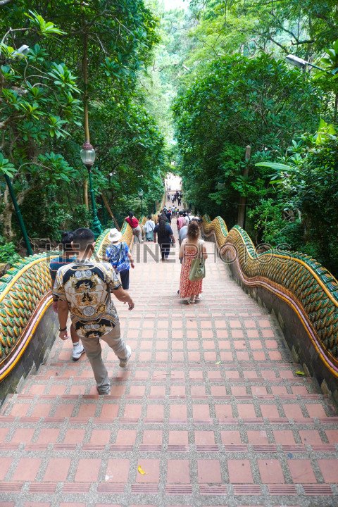 stairs going down to the The gold Temple grounds in Wat Prathat Doi Suthep, Thailand