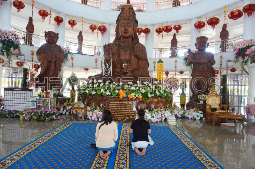 Buddhists worshiping inside The red Temple in Wat Huay Pla Kang, Thailand