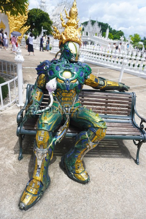 A Solider like statue sitting at the entrance of the White Temple in Wat Rong Khun, Thailand