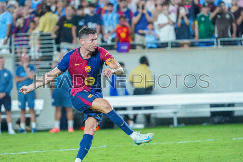 Orlando, Florida, USA, July 30, 2024, FC Barcelona forward Robert Lewandowski #9 shoots a penalty kick during the 2024 FC Series at Camping World Stadium. (Photo Credit: Marty Jean-Louis)