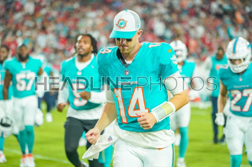 Tampa Bay, Florida, USA, August 33, 2024, Miami Dolphins quarterback Mike White #14 at Raymond James Stadium. (Photo Credit: Marty Jean-Louis)