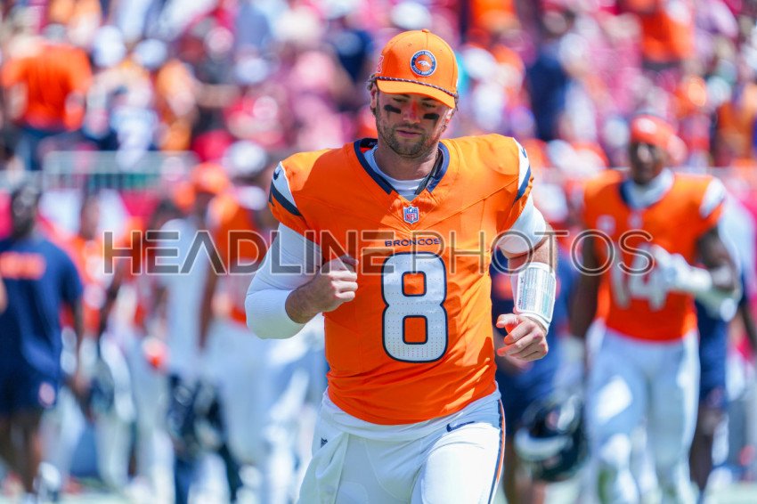 Tampa Bay, Florida, USA, September 22, 2024, Denver Broncos player Jarrett Stidham #8 at Raymond James Stadium. (Photo Credit: Marty Jean-Louis)