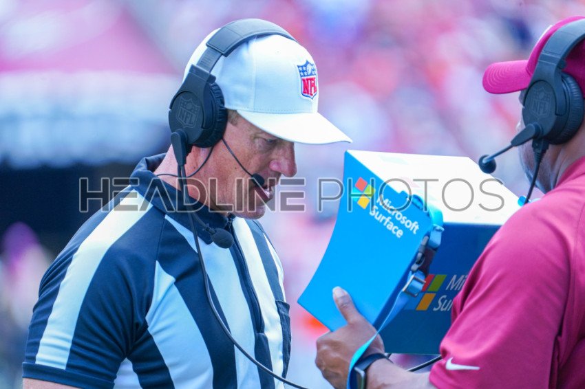 Tampa Bay, Florida, USA, September 22, 2024, Referee Alan Eck reviews a play during Denver Broncos vs Tampa Bay Buccaneers game at Raymond James Stadium. (Photo Credit: Marty Jean-Louis)