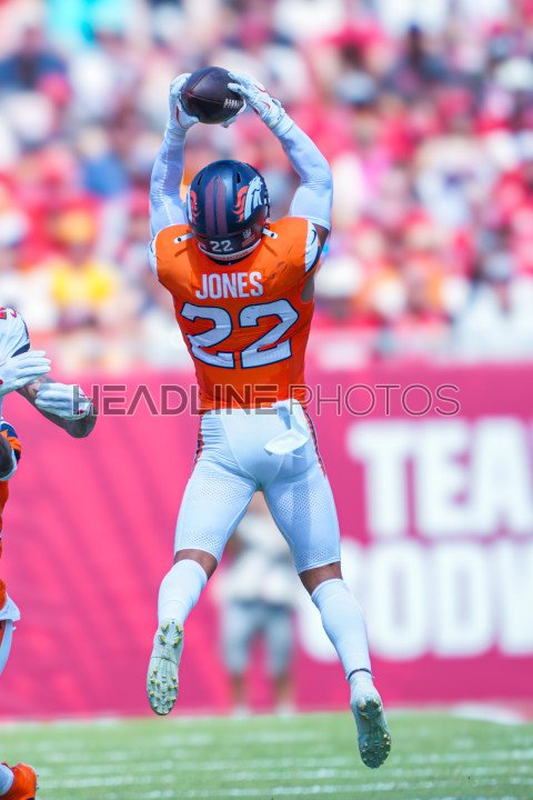 Tampa Bay, Florida, USA, September 22, 2024, Denver Broncos safety Brandon Jones #22 makes an interception at Raymond James Stadium. (Photo Credit: Marty Jean-Louis)