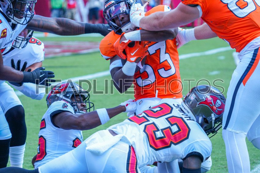 Tampa Bay, Florida, USA, September 22, 2024, Denver Broncos runningback Javonte Williams #33 gets tackled at Raymond James Stadium. (Photo Credit: Marty Jean-Louis)