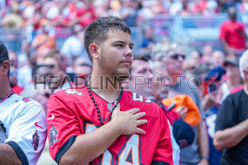Tampa Bay, Florida, USA, September 22, 2024, Tampa Bay Buccaneers fan during the opening ceremony at Raymond James Stadium. (Photo Credit: Marty Jean-Louis)