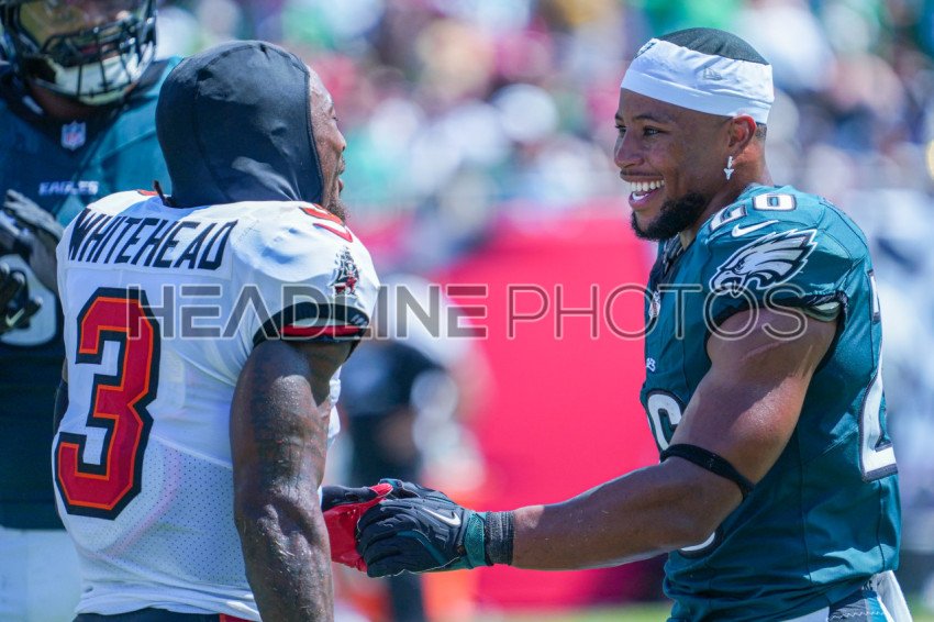 Tampa Bay, Florida, USA, September 29, 2024, Philadelphia Eagles player Saquon Barkley #26 (right) having a laugh with Tampa Bay Buccaneers player Jordan Whitehead #3 at Raymond James Stadium. (Photo Credit: Marty Jean-Louis)