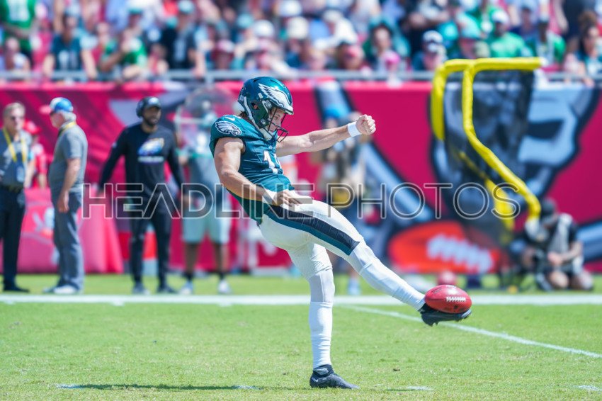 Tampa Bay, Florida, USA, September 29, 2024, Philadelphia Eagles punter Braden Mann #16 makes a kick at Raymond James Stadium. (Photo Credit: Marty Jean-Louis)