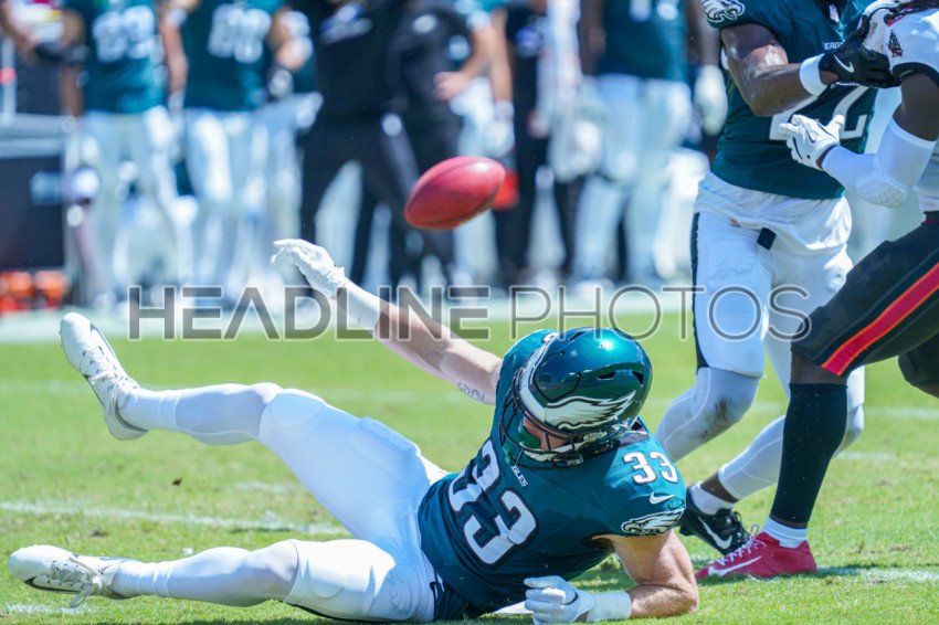 Tampa Bay, Florida, USA, September 29, 2024, Philadelphia Eagles player Cooper DeJean #33 lost control of the ball at Raymond James Stadium. (Photo Credit: Marty Jean-Louis)