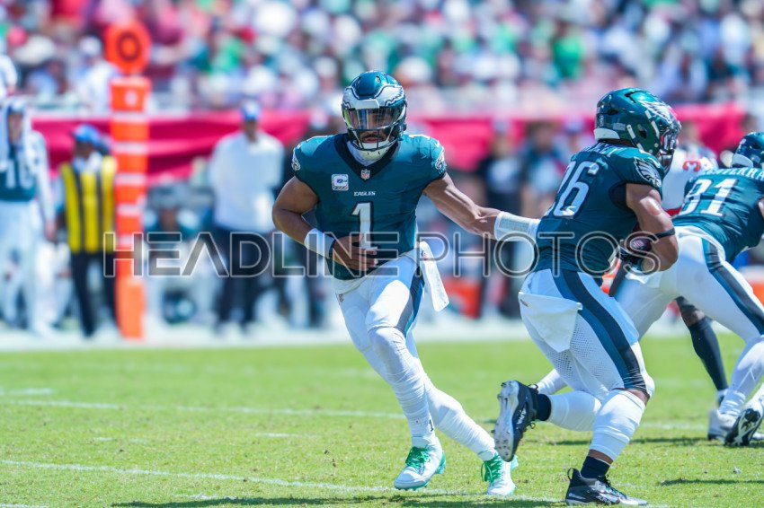 Tampa Bay, Florida, USA, September 29, 2024, Philadelphia Eagles quarterback Jalen Hurts #1 makes a pass to runningback Saquon Barkley #26 at Raymond James Stadium. (Photo Credit: Marty Jean-Louis)