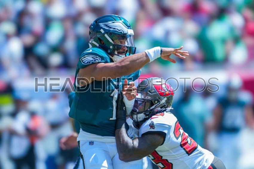 Tampa Bay, Florida, USA, September 29, 2024, Philadelphia Eagles quarterback Jalen Hurts #1 makes a pass while being tackled at Raymond James Stadium. (Photo Credit: Marty Jean-Louis)