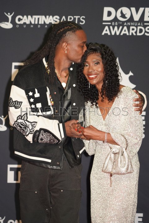 Nashville, Tennessee, USA, October 1, 2024. Rapper KB with his mom At the Red carpet during the 55th Annual GMA Dove Awards at Lipscomb University Allen Arena (Photo Credit: Marty Jean-Louis)