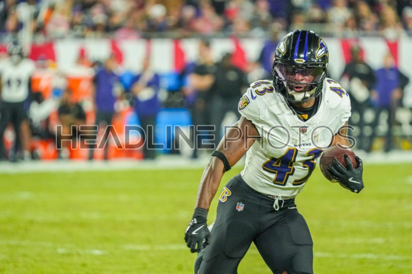 Tampa Bay, Florida, USA, October 21, 2024, Baltimore Ravens runnigback Justice Hill #43 makes a run at Raymond James Stadium. (Photo Credit: Marty Jean-Louis)