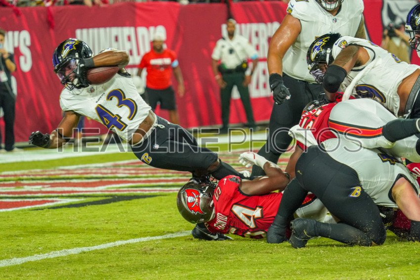 Tampa Bay, Florida, USA, October 21, 2024, Baltimore Ravens player Justice Hill #43 gets tackled but makes a touchdown at Raymond James Stadium. (Photo Credit: Marty Jean-Louis)