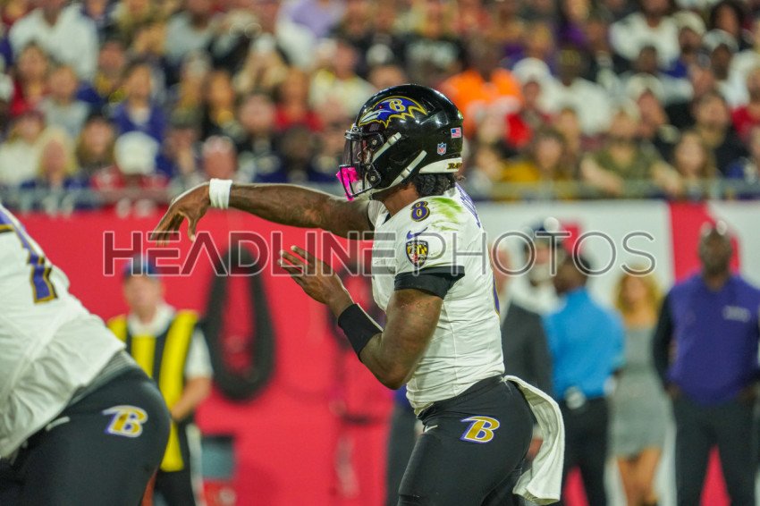 Tampa Bay, Florida, USA, October 21, 2024, Baltimore Ravens quarterback Lamar Jackson #8 makes a pass at Raymond James Stadium. (Photo Credit: Marty Jean-Louis)