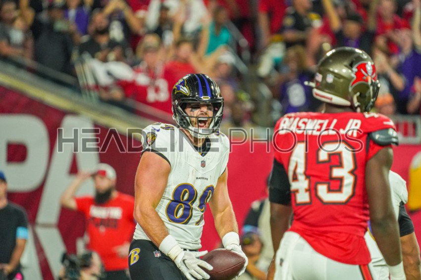 Tampa Bay, Florida, USA, October 21, 2024, Baltimore Ravens Tight End Mark Andrews #89 celebrate after making a touchdown at Raymond James Stadium. (Photo Credit: Marty Jean-Louis)