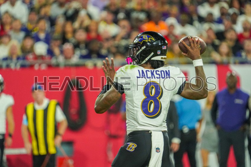 Tampa Bay, Florida, USA, October 21, 2024, Baltimore Ravens quarterback Lamar Jackson #8 readies to make a pass at Raymond James Stadium. (Photo Credit: Marty Jean-Louis)