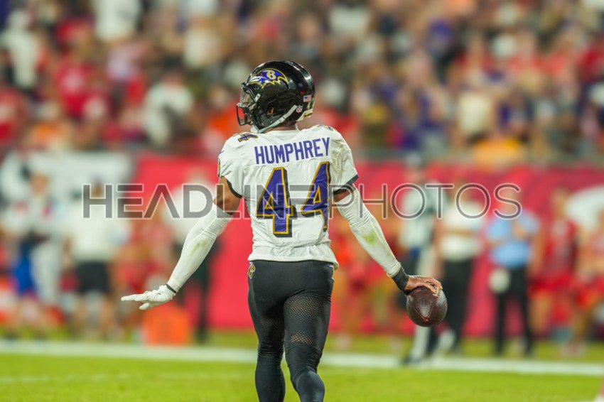 Tampa Bay, Florida, USA, October 21, 2024, Baltimore Ravens player Marlon Humphrey #44 celebrte after making a touchdown at Raymond James Stadium. (Photo Credit: Marty Jean-Louis)