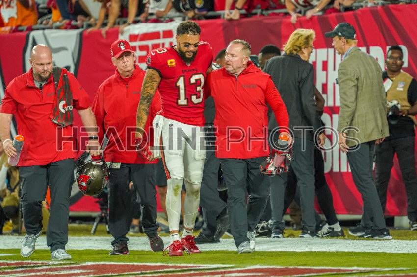 Tampa Bay, Florida, USA, October 21, 2024,Tampa Bay Buccaneers wide receiver Mike Evans #13 walks with a medical staff after being injured at Raymond James Stadium. (Photo Credit: Marty Jean-Louis)
