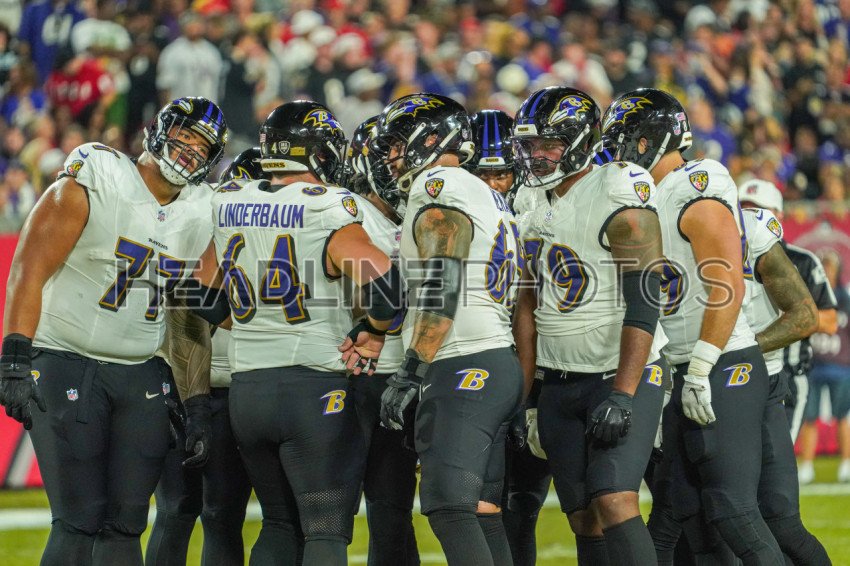 Tampa Bay, Florida, USA, October 21, 2024, Baltimore Ravens players huddle at Raymond James Stadium. (Photo Credit: Marty Jean-Louis)