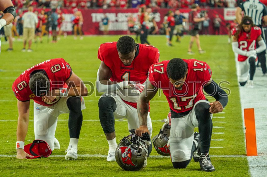 Tampa Bay, Florida, USA, October 21, 2024, Tampa Bay Buccaneers players Baker Mayfield #6, Rachaad White #1 and Sterling Shepard #17 praying before the game at Raymond James Stadium. (Photo Credit: Marty Jean-Louis)