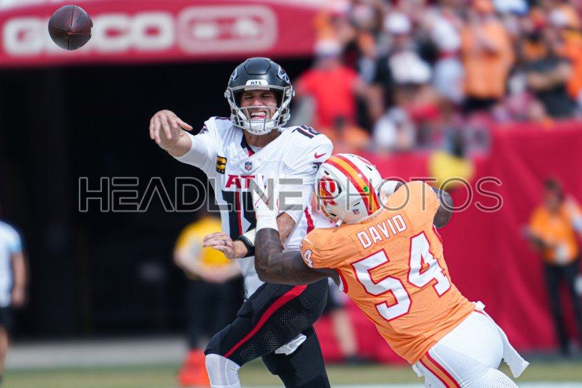 Tampa Bay, Florida, USA, October 27, 2024, Atlanta Falcons quarterback Kyle Pitts #8 makes a pass as he gets tackled by Lavonte David #54 at Raymond James Stadium. (Photo Credit: Marty Jean-Louis)