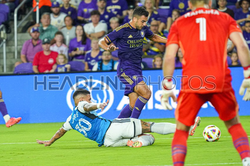 Orlando, Florida, USA, October 27, 2024, Orlando City SC midfielder Martín Ojeda #11 runs forward but Junior Urso #30 kicks the ball out at Inter&Co Stadium. (Photo Credit: Marty Jean-Louis)