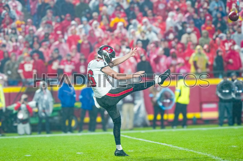 Kansas City, Missouri, USA, November 4, 2024, Tampa Bay Buccaneers Punter Trenton Gill #16 makes a kick at GEHA Field Arrowhead Stadium. (Photo Credit: Marty Jean-Louis)