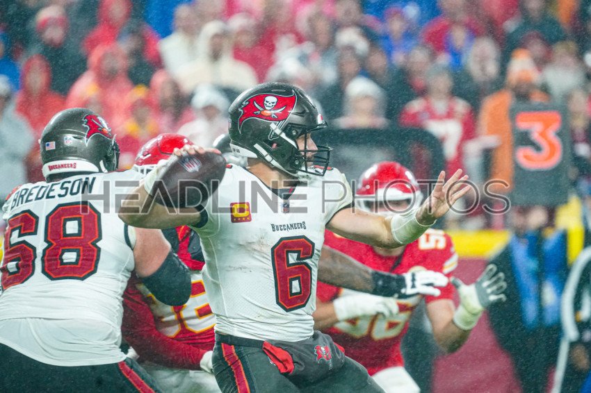 Kansas City, Missouri, USA, November 4, 2024, Tampa Bay Buccaneers quarterback Baker Mayfield #6 makes a pass at GEHA Field Arrowhead Stadium. (Photo Credit: Marty Jean-Louis)