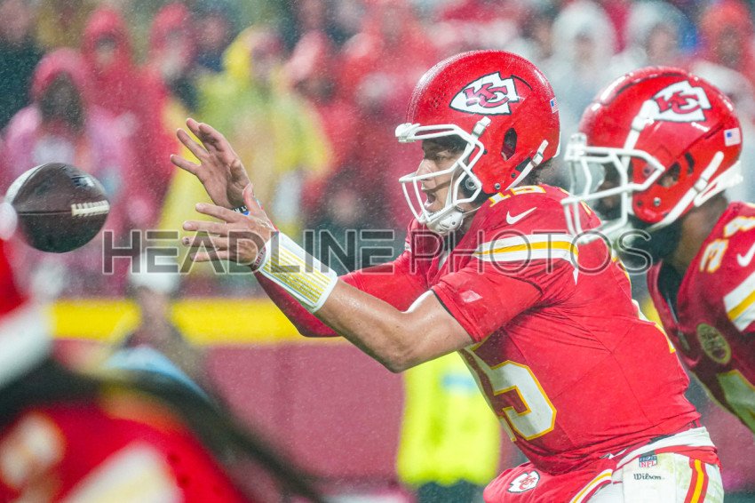 Kansas City, Missouri, USA, November 4, 2024, Kansas City Chiefs quarterback Patrick Mahomes #15 receives the ball at GEHA Field Arrowhead Stadium. (Photo Credit: Marty Jean-Louis)