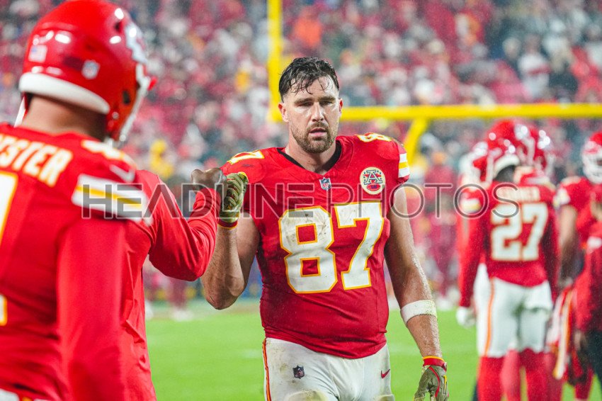 Kansas City, Missouri, USA, November 4, 2024, Kansas City Chiefs player Travis Kelce #87 gives a bump to a team mate at GEHA Field Arrowhead Stadium. (Photo Credit: Marty Jean-Louis)