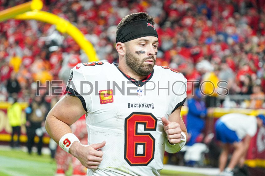 Kansas City, Missouri, USA, November 4, 2024, Tampa Bay Buccaneers quarterback Baker Mayfield #6 runs to the locker at GEHA Field Arrowhead Stadium. (Photo Credit: Marty Jean-Louis)