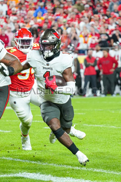 Kansas City, Missouri, USA, November 4, 2024, Tampa Bay Buccaneers player Rachaad White #1 makes a run at GEHA Field Arrowhead Stadium. (Photo Credit: Marty Jean-Louis)