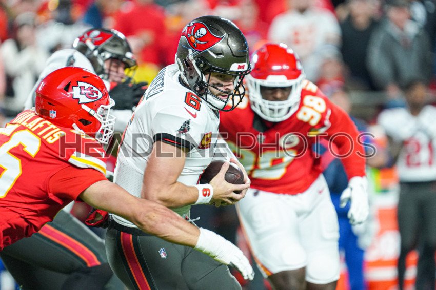 Kansas City, Missouri, USA, November 4, 2024, Tampa Bay Buccaneers quarterback Baker Mayfield #6 gets tackled at GEHA Field Arrowhead Stadium. (Photo Credit: Marty Jean-Louis)