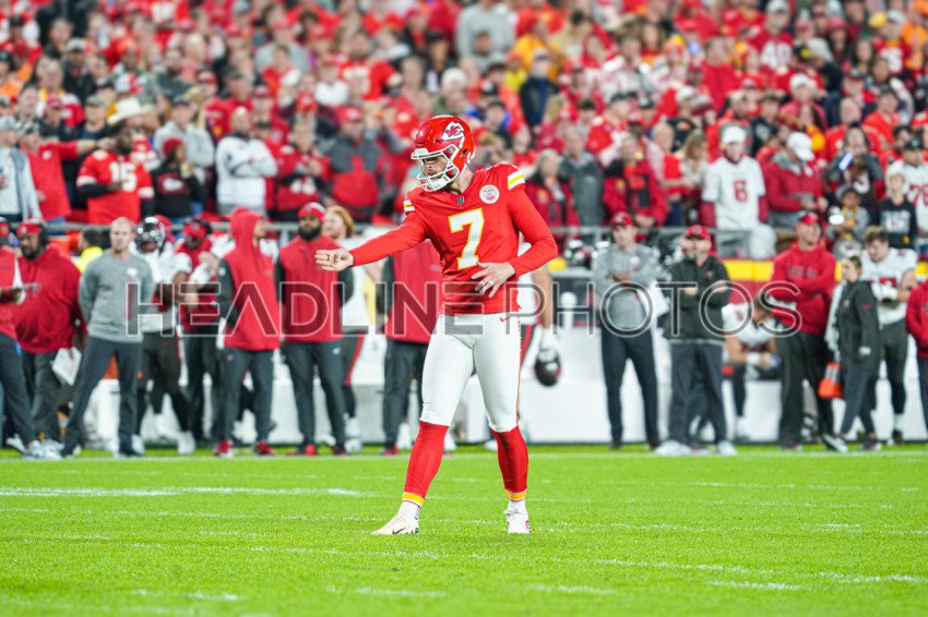 Kansas City, Missouri, USA, November 4, 2024, Kansas City Chiefs kicker Harrison Butker #7 readies to make a kick at GEHA Field Arrowhead Stadium. (Photo Credit: Marty Jean-Louis)