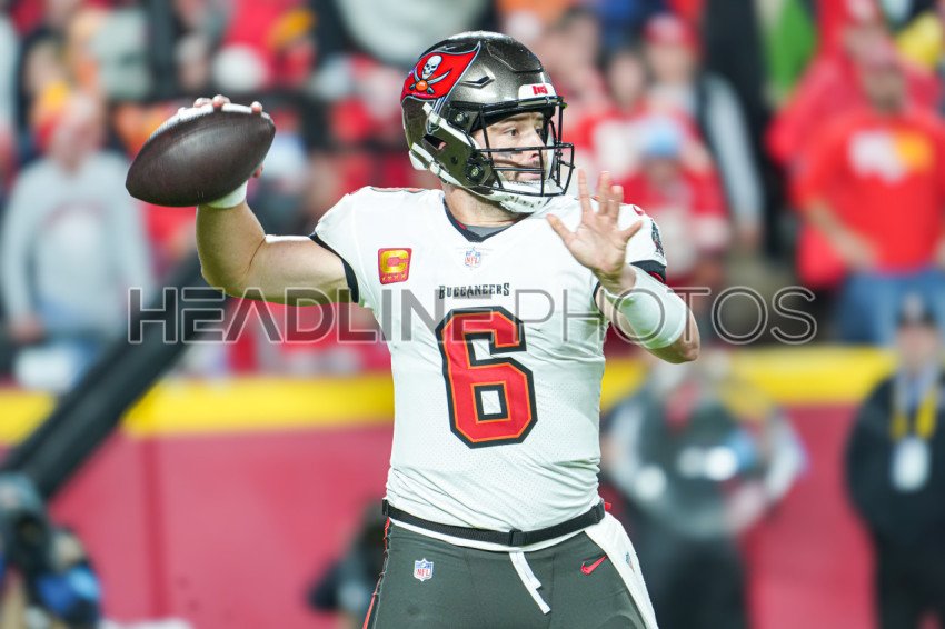 Kansas City, Missouri, USA, November 4, 2024, Tampa Bay Buccaneers quarterback Baker Mayfield #6 makes a pass at GEHA Field Arrowhead Stadium. (Photo Credit: Marty Jean-Louis)