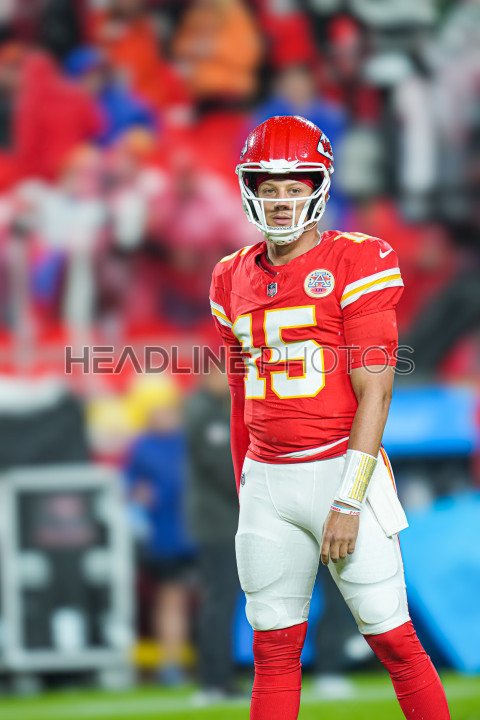 Kansas City, Missouri, USA, November 4, 2024, Kansas City Chiefs quarterback Patrick Mahomes #15 warming up at GEHA Field Arrowhead Stadium. (Photo Credit: Marty Jean-Louis)