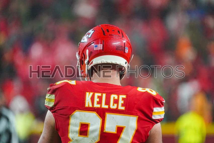 Kansas City, Missouri, USA, November 4, 2024, Kansas City Chiefs tight end Travis Kelce #87 puts on his helment during overtime at GEHA Field Arrowhead Stadium. (Photo Credit: Marty Jean-Louis)