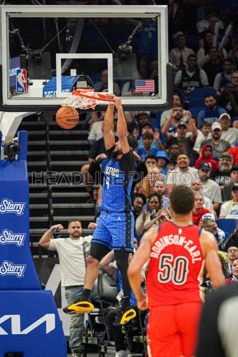 Orlando, Florida, USA, November 8, 2024, Orlando Magic guard Jalen Suggs #4 makes a dunk at the Kia Center. (Photo Credit: Marty Jean-Louis)