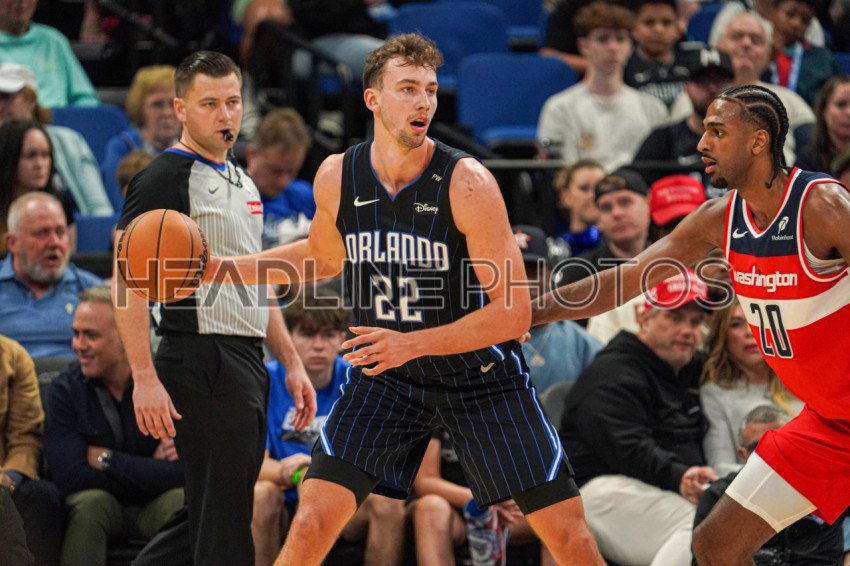 Orlando, Florida, USA, November 10, 2024, Orlando Magic forward Franz Wagner #22 guards the ball at the Kia Center. (Photo Credit: Marty Jean-Louis)