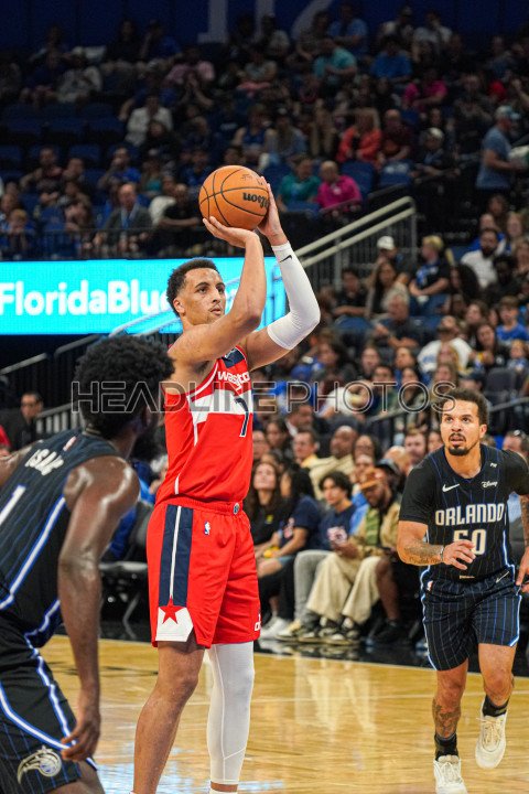 Orlando, Florida, USA, November 10, 2024, Washington Wizards player Johnny Davis #1 shoots a free throw at the Kia Center. (Photo Credit: Marty Jean-Louis)